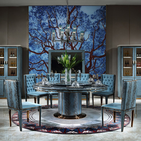 Juego de mesa de comedor giratoria de lujo moderno, sillas de 6 plazas, tapa de mármol natural azul, muebles de acero inoxidable para el hogar para uso en hoteles