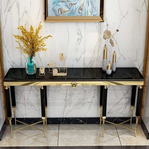 Luxo hotel home sala móveis entrada lateral mesa luxo ouro aço inoxidável mármore top preto entrada console tabelas
